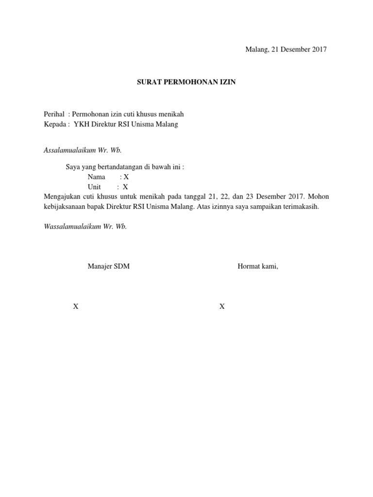 Dengan ini saya mengajukan izin cuti menikah terhitung mulai tanggal 26 sampai dengan 30 september 2004. Jika acara pernikahanmu dilakukan satu atau dua hari. September 18, 2016september 19, 2016. Surat izin orang tua untuk menikah. Tenggarong, nopember 2017 kepada perihal :